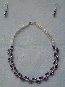 Ras-de-cou et boucles d'oreille en perles (Swarovski, rocailles), artisanat.