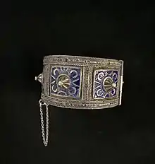 Les bijoux berbères traditionnels se composent principalement d'argent, coulé dans un moule puis finis à la main[24],[25]. Selon les régions ainsi que le type de bijoux, du verre émaillé, des coraux, des perles d'ambre et de verre coloré ou plus rarement des pierres semi-précieuses sont appliqués. Selon les historiens de l'art, l'art de l'émaillage selon la technique du cloisonné est introduit par des orfèvres juifs séfarades, qui à leur tour avaient hérité de ce savoir-faire de leurs ancêtres maures d'Al-Andalus[26],[27]. Une autre méthode utilisée au Maghreb est appelée filigrané, car un fil en filigrane d'argent fin est utilisé pour des motifs complexes en forme de maille, pour marquer les limites des perles insérées ou les zones pour chaque couleur de l'espace émaillé dans les tons typiques de jaune, vert et bleu, avant l'application de la poudre de verre fondue. Les bijoux berbères émaillés sont produits en Algérie (Grande Kabylie), au Maroc (Tiznit et Anti-Atlas) ainsi qu'en Tunisie (Moknine et Djerba)[28]. Les parties visibles des pièces qui ne sont pas couvertes par l'émaillage ou la technique du filigrané son pour la plupart recouvertes de motifs gravés ou ciselés martelés dans l'argent et souvent aussi rendus plus visibles en appliquant la technique du niellage[29].