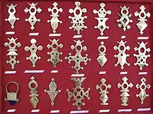 Les bijoux en argent, en verre coloré ou en fer sont également une tradition particulière des Touaregs[17],[18]. Ils appartiennent aux peuples berbères et vivent encore pour la plupart en tant que semi-nomades dans certaines parties du Sahara, dans la région du Hoggar de l'actuelle Algérie, au Mali, en Libye, au Niger et au Burkina Faso. Leur joaillerie est remarquable pour la croix d'Agadez, même si seules quelques-unes de ces pièces ressemblent réellement à une croix. La plupart sont portés en pendentifs aux formes variées, qui ressemblent soit à une croix, soit à la forme d'une plaque ou d'un bouclier. Historiquement, les plus anciens spécimens connus étaient en pierre ou en cuivre, mais par la suite les forgerons touaregs ont également utilisé du fer et de l'argent fabriqués selon la technique de la fonte à la cire perdue. Cette pièce est devenue un symbole national et africain de la culture touareg et des droits politiques[19]. De nos jours, ces bijoux sont souvent fabriqués pour les touristes ou comme articles de mode de style ethnique pour les clients d'autres pays, avec certaines modifications modernes[20].