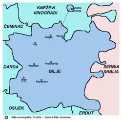 Bilje (en hongrois : Bellye[1]) est un village et une municipalité située en Slavonie, dans le comitat d'Osijek-Baranja, dans le nord-est de la Croatie. Elle se trouve à 5 km au nord-est d'Osijek, en bordure du parc naturel de Kopački Rit.