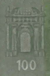 Le billet de 100 euros est la troisième coupure en euro avec la valeur la plus haute, mesurant 147 × 82 millimètres (série 2002) et 147 × 77 millimètres (série 2019). Il est de couleur verte[4]. Ils représentent tous des ponts, arches et portes dans des styles historiques européens différents. Le billet de 100 euros dépeint l'architecture baroque (entre les XVIIe et XVIIIe siècles)[4]. Les dessins initiaux de Robert Kalina devaient représenter de vrais monuments existants, mais pour des raisons politiques, le pont et l'arche sont plus simplement des exemples hypothétiques de l'ère architecturale romane[16].