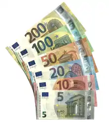 Depuis la création de la monnaie unique européenne, il existe sept billets en euros, émis en deux séries, dont les valeurs faciales s'échelonnent de 5 à 500 euros. La première série a été mise en circulation à partir du . La deuxième série a commencé à remplacer la première à partir du . Contrairement aux pièces en euros, l'aspect des billets est le même pour l'ensemble de la zone euro. Ils sont cependant imprimés et émis par les différents États membres. Comme pour les pièces et quel que soit le pays émetteur, les billets sont utilisables dans tous les pays dont l'euro est la monnaie. Ils sont conçus en pure fibre de coton, ce qui leur donne une meilleure résistance et ce qui permet de les reconnaître facilement au toucher[7]. Jusqu'à présent, la taille des billets s'échelonne d'un format de 120 × 62 millimètres pour le billet de 5 euros à 160 × 82 millimètres pour le billet de 500 euros. Ils ont tous une couleur différente, qui tranche en particulier avec les billets de valeurs proches, afin de pouvoir bien les distinguer[8].