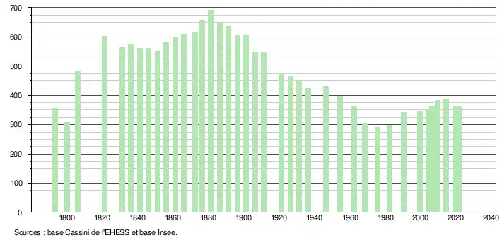 L'évolution du nombre d'habitants est connue à travers les recensements de la population effectués dans la commune depuis 1793. Pour les communes de moins de 10 000 habitants, une enquête de recensement portant sur toute la population est réalisée tous les cinq ans, les populations légales des années intermédiaires étant quant à elles estimées par interpolation ou extrapolation[33]. Pour la commune, le premier recensement exhaustif entrant dans le cadre du nouveau dispositif a été réalisé en 2004[34].