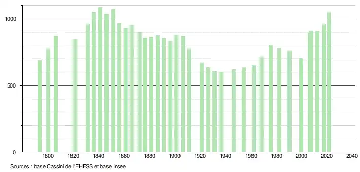 L'évolution du nombre d'habitants est connue à travers les recensements de la population effectués dans la commune depuis 1793. Pour les communes de moins de 10 000 habitants, une enquête de recensement portant sur toute la population est réalisée tous les cinq ans, les populations légales des années intermédiaires étant quant à elles estimées par interpolation ou extrapolation[24]. Pour la commune, le premier recensement exhaustif entrant dans le cadre du nouveau dispositif a été réalisé en 2007[25].