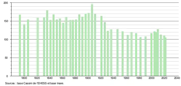 L'évolution du nombre d'habitants est connue à travers les recensements de la population effectués dans la commune depuis 1793. Pour les communes de moins de 10 000 habitants, une enquête de recensement portant sur toute la population est réalisée tous les cinq ans, les populations légales des années intermédiaires étant quant à elles estimées par interpolation ou extrapolation[31]. Pour la commune, le premier recensement exhaustif entrant dans le cadre du nouveau dispositif a été réalisé en 2004[32].