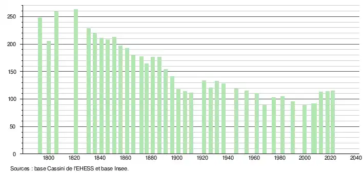 L'évolution du nombre d'habitants est connue à travers les recensements de la population effectués dans la commune depuis 1793. Pour les communes de moins de 10 000 habitants, une enquête de recensement portant sur toute la population est réalisée tous les cinq ans, les populations légales des années intermédiaires étant quant à elles estimées par interpolation ou extrapolation[24]. Pour la commune, le premier recensement exhaustif entrant dans le cadre du nouveau dispositif a été réalisé en 2007[25].