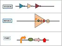 Les éléments "BioBricks" sont utilisées en appliquant les principes d'ingénierie de l'abstraction et de la modularisation. Les bio-briques forment le socle du système hiérarchique sur lequel la biologie de synthèse est basée ; avec trois niveaux de hiérarchie :