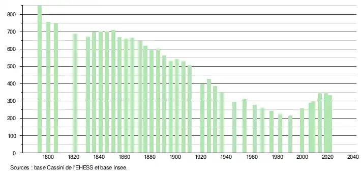 L'évolution du nombre d'habitants est connue à travers les recensements de la population effectués dans la commune depuis 1793. Pour les communes de moins de 10 000 habitants, une enquête de recensement portant sur toute la population est réalisée tous les cinq ans, les populations légales des années intermédiaires étant quant à elles estimées par interpolation ou extrapolation[37]. Pour la commune, le premier recensement exhaustif entrant dans le cadre du nouveau dispositif a été réalisé en 2008[38].