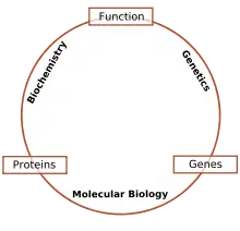 Depuis la fin des années 1950 et le début des années 1960, les biologistes moléculaires ont appris à caractériser, isoler et manipuler les composants moléculaires des cellules et des organismes. Ces composants incluent l'ADN, support de l'information génétique, l'ARN, proche de l'ADN dont les fonctions vont de la copie provisoire d'ADN jusqu'aux réelles fonctions structurelles et enzymatiques et qui est une partie fonctionnelle et structurelle de l'appareil traductionnel, et les protéines, molécules structurelles et enzymatiques les plus importantes des cellules.[réf. nécessaire]