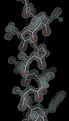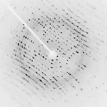 La résolution de la structure cristallographique est basée sur l'étude de la diffraction des rayons X par des cristaux de macromolécules. Les rayons X sont diffractés par les électrons et l'analyse permet de remonter à la densité électronique de la molécule, c'est-à-dire la localisation des électrons qui gravitent autour d'elle. Cette densité, pourvu qu'elle soit suffisamment précise, permet de remonter à la localisation de chaque atome de la molécule et donc à ses coordonnées cartésiennes.