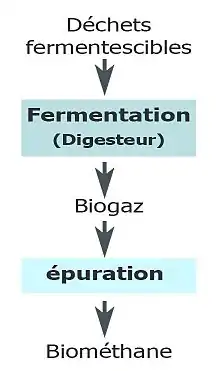 Le biogaz utilisé pour produire le biométhane provient des digesteurs d'unité de méthanisation, c'est-à-dire d'une dégradation biologique de la matière organique contenue dans des « substrats » fermentescibles. Ces derniers ont plusieurs types d'origines :