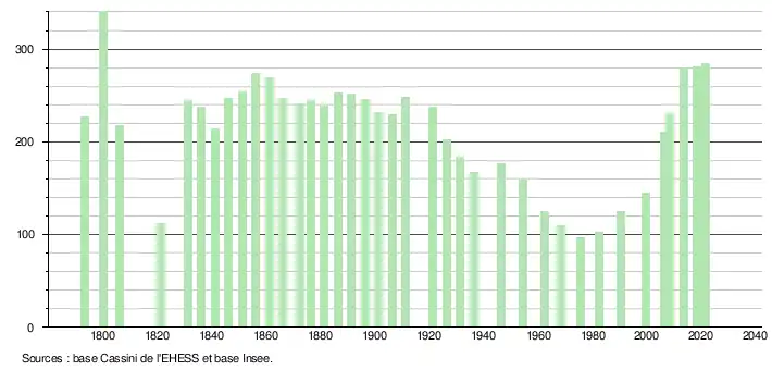 L'évolution du nombre d'habitants est connue à travers les recensements de la population effectués dans la commune depuis 1793. Pour les communes de moins de 10 000 habitants, une enquête de recensement portant sur toute la population est réalisée tous les cinq ans, les populations légales des années intermédiaires étant quant à elles estimées par interpolation ou extrapolation[24]. Pour la commune, le premier recensement exhaustif entrant dans le cadre du nouveau dispositif a été réalisé en 2008[25].