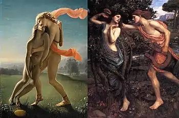 De même dans Le Banquet de Platon, Aristophane relate un mythe platonicien : à l'origine, il y avait trois types d'êtres humains, les mâles, les femelles et l'androgyne. Chaque être était pourvu de deux sexes : le mâle avait deux pénis, la femelle deux vagins, alors que l'androgyne possédait les deux sexes[37]. Voulant se rebeller contre les dieux, ces êtres se retrouvent coupés en deux par Zeus en guise de châtiment ; pris de pitié pour l'espèce humaine, il demande toutefois à Apollon de les soigner afin qu'ils ne meurent pas de cette blessure. Malgré leur guérison, les êtres humains, à présent séparés, n'ont de cesse que de chercher à se retrouver par l'union sexuelle : ainsi le récit explique-t-il les attirances des hommes envers les hommes, les attirances des hommes envers les femmes, et les attirances des femmes envers les femmes[38]. Dans le même texte, Phèdre estime que l'amour ultime « fait que les hommes, comme les femmes mourraient pour leur moitié », citant en exemple Alceste, prête à se sacrifier pour son mari Admète, et Achille, prêt à mourir pour Patrocle[39].