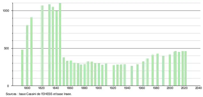 L'évolution du nombre d'habitants est connue à travers les recensements de la population effectués dans la commune depuis 1793. Pour les communes de moins de 10 000 habitants, une enquête de recensement portant sur toute la population est réalisée tous les cinq ans, les populations légales des années intermédiaires étant quant à elles estimées par interpolation ou extrapolation[24]. Pour la commune, le premier recensement exhaustif entrant dans le cadre du nouveau dispositif a été réalisé en 2007[25].