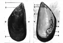 La fermeture de la coquille est un phénomène actif assuré par un muscle adducteur (espèces monomyaires) ou deux (espèces dimyaires telles que palourdes et moules). L'impression du manteau sur l'intérieur de l'une des deux valves est dite impression palléale. Quand les impressions musculaires sur la coquille sont égales, le bivalve est dit homomyaire ou isomyaire ; quand elles sont inégales, il est dit hétéromyaire ou anisomyaire[36]. L'impression musculaire antérieure, souvent plus réduite, est située au-dessous de la bouche. L'impression musculaire postérieure, souvent plus développée, est située au-dessous de l'anus.