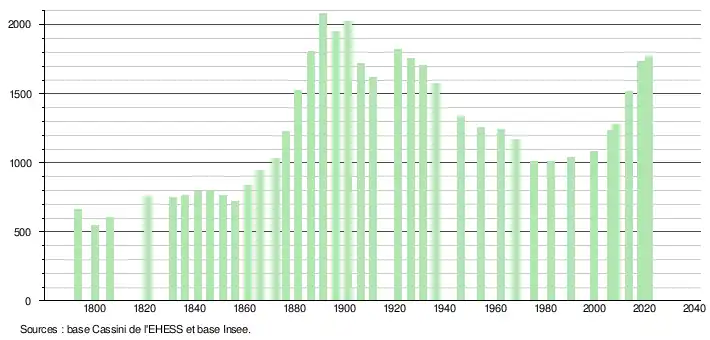 | L'évolution du nombre d'habitants est connue à travers les recensements de la population effectués dans la commune depuis 1793. Pour les communes de moins de 10 000 habitants, une enquête de recensement portant sur toute la population est réalisée tous les cinq ans, les populations légales des années intermédiaires étant quant à elles estimées par interpolation ou extrapolation[35]. Pour la commune, le premier recensement exhaustif entrant dans le cadre du nouveau dispositif a été réalisé en 2008[36]. En 2021, la commune comptait 1 767 habitants[Note 6], en augmentation de 10,85 % par rapport à 2015 (Aude : +2,47 %, France hors Mayotte : +1,84 %). |