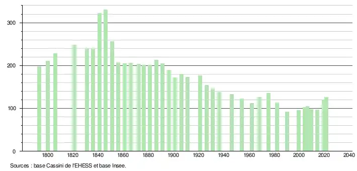 L'évolution du nombre d'habitants est connue à travers les recensements de la population effectués dans la commune depuis 1793. Pour les communes de moins de 10 000 habitants, une enquête de recensement portant sur toute la population est réalisée tous les cinq ans, les populations légales des années intermédiaires étant quant à elles estimées par interpolation ou extrapolation[20]. Pour la commune, le premier recensement exhaustif entrant dans le cadre du nouveau dispositif a été réalisé en 2004[21].