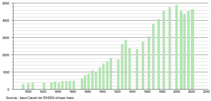 L'évolution du nombre d'habitants est connue à travers les recensements de la population effectués dans la commune depuis 1793. Pour les communes de moins de 10 000 habitants, une enquête de recensement portant sur toute la population est réalisée tous les cinq ans, les populations légales des années intermédiaires étant quant à elles estimées par interpolation ou extrapolation[22]. Pour la commune, le premier recensement exhaustif entrant dans le cadre du nouveau dispositif a été réalisé en 2005[23].