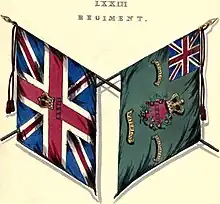 Les drapeaux du 73e régiment : King's Colour (le drapeau du Royaume-Uni) à gauche et Regimental Colour (de la couleur distinctive du régiment) à droite.