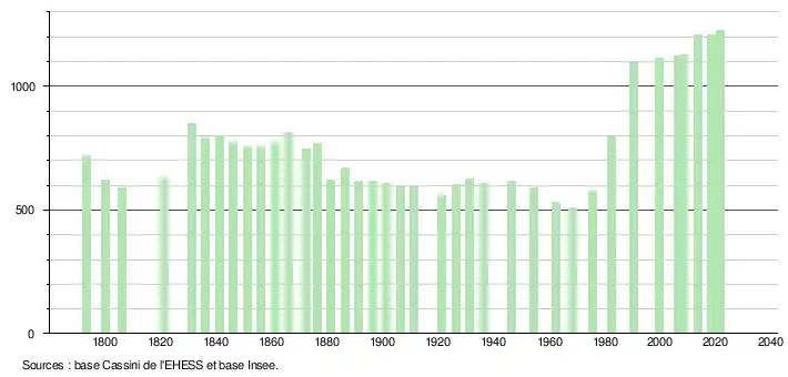 L'évolution du nombre d'habitants est connue à travers les recensements de la population effectués dans la commune depuis 1793. Pour les communes de moins de 10 000 habitants, une enquête de recensement portant sur toute la population est réalisée tous les cinq ans, les populations légales des années intermédiaires étant quant à elles estimées par interpolation ou extrapolation[37]. Pour la commune, le premier recensement exhaustif entrant dans le cadre du nouveau dispositif a été réalisé en 2008[38].