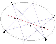 Dès l'âge de seize ans, Pascal commence à travailler sur ce qui deviendra plus tard la géométrie projective. Il utilise et approfondit les travaux du Brouillon-project d'une atteinte aux evenemens des rencontres du cone avec un plan[76] de Girard Desargues ainsi que ceux d'Apollonios de Perga. Ainsi, en 1640, il fait imprimer son Essai pour les coniques[22] et achève, en 1648, un traité de la Generatio conisectionum (Génération des sections coniques), dont il ne reste que des extraits pris par Leibniz[77]. La grande innovation est le théorème de Pascal qui dit que l’hexagramme formé par six points d’une conique a ses côtés opposés concourants en trois points alignés.