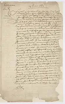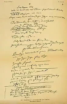 Le , Pascal vit sa « nuit de feu »[41],[42]. Il en consigne immédiatement le souvenir pour lui-même dans une note brève, connue sous le nom de « Mémorial » : « ✝ L’an de grâce 1654. Lundi 23 novembre, jour de saint Clément, pape et martyr […] Depuis environ dix heures et demie du soir jusques environ minuit et demi, feu. Dieu d’Abraham, Dieu d’Isaac, Dieu de Jacob, non des philosophes et des savants. Certitude, certitude. Sentiment. Joie. Paix […] » ; le manuscrit s’achève sur cette décision : « Renonciation totale et douce. Soumission totale à Jésus-Christ et à mon directeur », avec cette citation du Psaume 119, 16 : « Non obliviscar sermones tuos. Amen »[alpha 6]. Il coud soigneusement ce document dans son manteau et le transfère toujours quand il change de vêtement ; un serviteur le découvrira par hasard après sa mort.