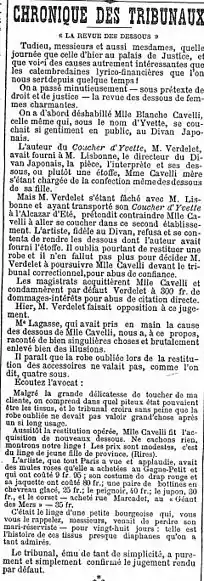 Le spectacle est repris en à l'Alcazar d'été aux Champs-Élysées[29] mais Blanche refuse de s'y produire, tout comme au Théâtre de l'Eldorado de Lyon où elle est remplacée par Louise Willy[30]. En effet, fidèle à Maxime Lisbonne, elle refuse de suivre dans ces établissements M. Verdellet, auteur de la pièce Le Coucher d'Yvette et directeur du Casino de Lyon en 1888. M. Verdellet l'assigne alors en justice pour abus de confiance. Blanche lui rend les "dessous" dont l'étoffe était sa propriété mais garde la robe confectionnée par sa mère couturière Louisa Chevallier[31]. À l'occasion du procès où Maxime Lisbonne, convoqué, fit un scandale politique[32], chaque pièce de vêtements de la petite bourgeoise est évaluée : Une paire de mules roses achetée au Gagne-Petit, avenue de l'Opéra; un costume de drap rouge et jaquette, des bottines en chevreau glacé, un peignoir, jupon et corset achetés au Géant des Mers, rue Marcadet[33]. Le tribunal l'acquitte en appel le 31/1/1896 et elle reçoit des dommages et intérêts pour abus de citation directe[34],[35].