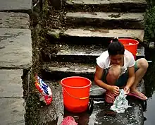 Autrefois souvent protégée et accroupie dans une caisse garnie de paille, appelée aussi « garde-genoux »[7] ou sur le bord incliné du lavoir ou encore sur une pierre plate, elle se saisit du linge placé dans le bac à linge à son côté et le plonge dans la rivière, dans la source ou la fontaine en contrebas, les plus modestes lavandières paysannes les genoux protégé par des houseaux à même le sol dans la mare éloignée après un transport parfois long. À la Belle Époque, les lavandières ou les ménagères plus fortunées ont la possibilité d'ajouter des paillettes de savons ou de sur-frotter avec du gros savon de Marseille.