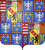 - « Écartelé, en 1 et 4 : coupé et parti en 3, au premier fascé de gueules et d'argent, au deuxième d'azur semé de lys d'or et au lambel de gueules, au troisième d'argent à la croix potencée d'or, cantonnée de quatre croisettes du même, au quatrième d'or aux quatre pals de gueules, au cinquième d'azur semé de lys d'or et à la bordure de gueules, au sixième d'azur au lion contourné d'or, armé, lampassé et couronné de gueules, au septième d'or au lion de sable armé et lampassé de gueules, au huitième d'azur semé de croisettes d'or et aux deux bar d'or. Sur le tout d'or à la bande de gueules chargé de trois alérions d'argent le tout brisé d'un lambel de gueules ; en 2 et 3 contre-écartelé en 1 et 4 d'azur, à l'aigle d'argent, becquée, languée et couronnée d'or et en 2 et 3 d'azur, à trois fleurs de lys d'or, à la bordure endentée de gueules et d'or. »