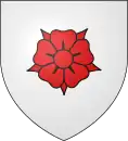 La charge principale est un meuble : comme son nom l'indique, il n'a pas de place spécifique. Toutefois, par défaut, on le considèrera comme placé au centre du champ. Si de plus il s'agit d'un meuble connu et répertorié, et qu'il se présente sous son aspect le plus usuel, il suffit alors d'indiquer sa couleur (laquelle peut parfois aussi être définie par défaut, mais ce, rarement). Un meuble est introduit avec un article indéfini (ce n'est pas une pièce de l'écu) : d'argent à une rose de gueules (à gauche, Pacy-sur-Eure). Si le meuble présente des particularités (de forme, de posture, etc), cela doit être blasonné avec les termes spécifiques (le plus souvent des participes de verbes). Les meubles peuvent aussi être chargés, bien que ce soit assez rare. |