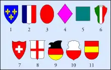 | Écartelé, | Formé de quatre éléments, qui seront numérotés 1, 2, 3 et 4, l'ordre de lecture étant de gauche à droite puis de haut en bas. | |