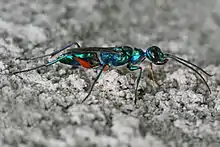 D'autres, comme les guêpes de la famille des Ampulicidae sont des parasitoïdes des adultes et des nymphes. Ces hyménoptères piquent la blatte directement dans un ganglion nerveux situé dans le thorax. Cette piqûre paralyse la blatte pendant près de 5 minutes, le temps nécessaire pour lui infliger une deuxième piqûre. La seconde est située dans une région du cerveau qui régit le réflexe de fuite[39]. Lorsque la victime reprend ses sens, elle ne tente pas de fuir. Ensuite, la guêpe saisit la blatte par ses antennes et l'apporte à son terrier. Elle pondra un œuf sur la blatte et bouchera l'entrée de la galerie. La blatte se fera dévorer vivante par la larve de la guêpe.