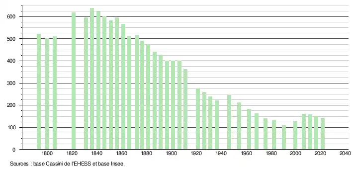 L'évolution du nombre d'habitants est connue à travers les recensements de la population effectués dans la commune depuis 1793. Pour les communes de moins de 10 000 habitants, une enquête de recensement portant sur toute la population est réalisée tous les cinq ans, les populations légales des années intermédiaires étant quant à elles estimées par interpolation ou extrapolation[13]. Pour la commune, le premier recensement exhaustif entrant dans le cadre du nouveau dispositif a été réalisé en 2006[14].