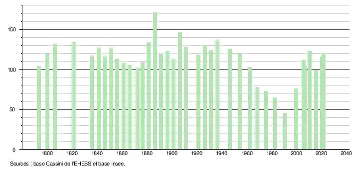 L'évolution du nombre d'habitants est connue à travers les recensements de la population effectués dans la commune depuis 1793. Pour les communes de moins de 10 000 habitants, une enquête de recensement portant sur toute la population est réalisée tous les cinq ans, les populations légales des années intermédiaires étant quant à elles estimées par interpolation ou extrapolation[26]. Pour la commune, le premier recensement exhaustif entrant dans le cadre du nouveau dispositif a été réalisé en 2005[27].