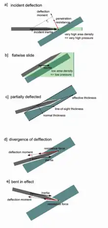 Le second effet tient dans la déviation, la déformation et le ricochet du projectile. Lorsqu'un projectile heurte une plaque sous une incidence élevée, sa trajectoire peut être courbée, l'obligeant à traverser une épaisseur plus grande, ou il peut rebondir sur le blindage. Le projectile peut également se déformer, ce qui réduit sa capacité de pénétration. Toutefois, ces effets sont fortement dépendants des matériaux utilisés pour le blindage et des propriétés du projectile. L'inclinaison du blindage peut dans certains cas augmenter la pénétration. Les ogives à charge creuse peuvent ne pas pénétrer et même exploser en cas d'impact sous un angle très oblique.