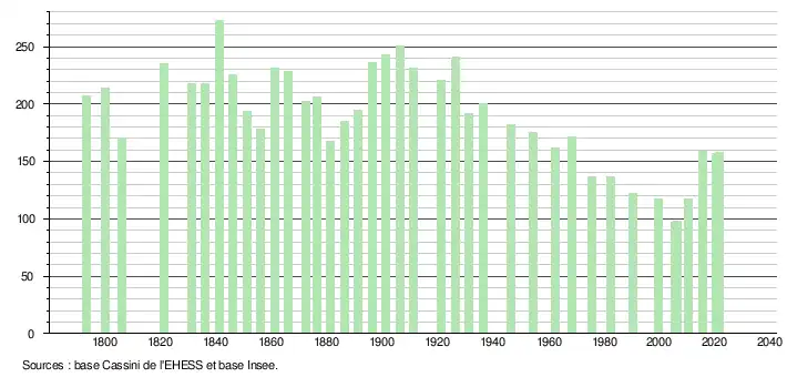 L'évolution du nombre d'habitants est connue à travers les recensements de la population effectués dans la commune depuis 1793. Pour les communes de moins de 10 000 habitants, une enquête de recensement portant sur toute la population est réalisée tous les cinq ans, les populations légales des années intermédiaires étant quant à elles estimées par interpolation ou extrapolation[32]. Pour la commune, le premier recensement exhaustif entrant dans le cadre du nouveau dispositif a été réalisé en 2005[33].