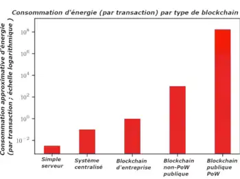 Le diagramme-barre rouge (ci-contre) compare approximativement la consommation électrique de différents types d'architectures de blockchain. Il montre qu'il existe une énorme différence (de plusieurs ordres de grandeur) entre la faible consommation électrique engendrée par une transaction moyenne traitée par un serveur «normal», et celle engendrée par des systèmes de blockchain, en particulier quand la chaine basée sur la «preuve de travail» (Proof of Work), comme c'est typiquement le cas pour le Bitcoin qui est de très loin la cryptomonnaie la plus consommatrice d'énergie. Et son principe de fonctionnement la condamne intrinsèquement à le devenir plus encore au fur et à mesure que le bitcoin se développera et/ou prendra de la valeur)[47].
