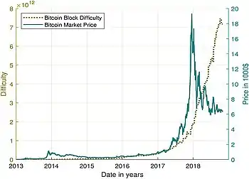 Plus le temps passe, plus la difficulté de minage augmente et moindre est le nombre de Bitcoins mis sur le marché... sans relation avec le cours de cette cryptomonnaie[49]. Plus la difficulté augmente, plus le minage consomme d'électricité.
