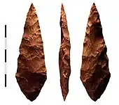 Les principaux marqueurs de la phase M1 sont de petites pointes foliacées bifaces caractéristiques de l’industrie Stillbay, finies ou abandonnées en cours de fabrication (photo). Plus de 400 ont été conservées. La silcrète est le principal matériau utilisé et la source la plus proche se trouve à environ 30 km. La présence d’un nombre important de petits éclats indique que ces pièces ont été produites sur place. Certaines de ces pointes présentent des fractures particulières indiquant qu'elles ont été utilisées comme pointes de projectiles[9]. Une étude expérimentale a montré que la finition de ces pointes foliacées avait été réalisée par retouche par pression, une technique qui n'était connue précédemment qu'à partir du Solutréen européen[10].