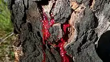 - Certains Corymbia, arbres de la famille des Myrtaceae proches des eucalyptus australiens. Le nom de bloodwood attribué à ces arbres est dû à l'abondante gomme rouge foncé ou brune qui apparaît en cas de blessure du tronc ou de sectionnement des racines.