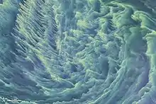 - quand les blooms concernent de vastes surfaces et qu'ils perdurent, des effets secondaires sur l’atmosphère peuvent exister, via les aérosols et molécules émises par les algues (et plus encore par les cyanophycées a-t-on récemment montré, pour ce qui concerne les émissions d'hydrocarbures halogénés halocarbures, destructeurs de la couche d'ozone[19]. Des quantités importantes de CHBr3, CH3I, CH2Br2 et de CHBr2Cl ont ainsi été produites par un bloom estival de cyanophycées étudié en mer Baltique (jusqu'à 0,3 pmol [μg chl a]−1h−1 pour le CHBr3 à la mi-journée).