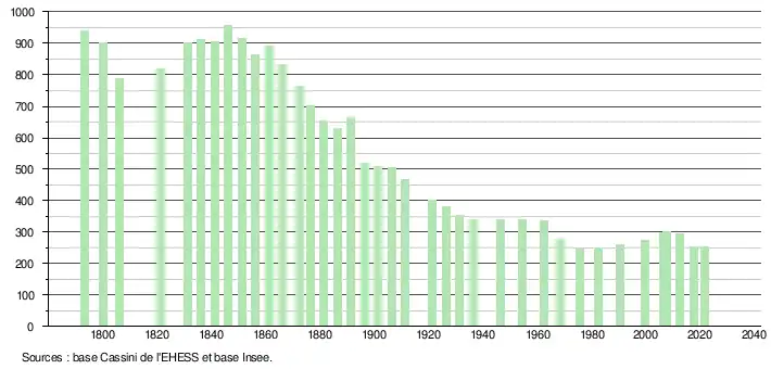 L'évolution du nombre d'habitants est connue à travers les recensements de la population effectués dans la commune depuis 1793. Pour les communes de moins de 10 000 habitants, une enquête de recensement portant sur toute la population est réalisée tous les cinq ans, les populations légales des années intermédiaires étant quant à elles estimées par interpolation ou extrapolation[21]. Pour la commune, le premier recensement exhaustif entrant dans le cadre du nouveau dispositif a été réalisé en 2007[22].