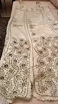 - la blouset el mensouj, confectionnée traditionnellement dans un type de soie dit mensouj, très prisée dans la ville de Tlemcen, se caractérise par des bandes verticales dorées, argentées et parfois colorées. Elle fait partie intégrante du trousseau de la mariée, elle est tissée selon des techniques héritées de la période médiévale[30]. Tlemcen est parvenue à sauvegarder cette pièce tissée manuellement par les artisans de la soie, appelés les harrar[31] ;