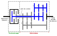 Les boîtes manuelles les plus utilisées de nos jours sont généralement constituées de deux arbres parallèles, dénommés arbre primaire (arbre d'entrée lié au vilebrequin par l'embrayage), et arbre secondaire (arbre de sortie de boîte) portant respectivement les pignons de vitesses et les pignons fous[alpha 5]. Outre les pignons fous, l'arbre secondaire porte également les systèmes de crabotage et les synchroniseurs, dispositifs placés sur des baladeurs, actionnés par les fourchettes de commandes liées au levier de vitesses, pouvant coulisser sur des cannelures de l'arbre.