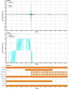 La photo de droite montre les courbes de données (non traitées) d'un accident réel enregistré avec un UDS. Les accélérations mesurées, la vitesse et les différents canaux d'état sont tracés dans le temps. On peut voir, par exemple, que les signaux spéciaux du véhicule ont été allumés avant la collision et que le conducteur appliquait encore le frein auparavant.
