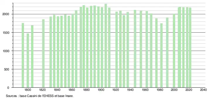 L'évolution du nombre d'habitants est connue à travers les recensements de la population effectués dans la commune depuis 1793. Pour les communes de moins de 10 000 habitants, une enquête de recensement portant sur toute la population est réalisée tous les cinq ans, les populations légales des années intermédiaires étant quant à elles estimées par interpolation ou extrapolation[24]. Pour la commune, le premier recensement exhaustif entrant dans le cadre du nouveau dispositif a été réalisé en 2007[25].