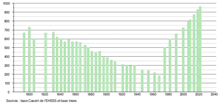 L'évolution du nombre d'habitants est connue à travers les recensements de la population effectués dans la commune depuis 1793. Pour les communes de moins de 10 000 habitants, une enquête de recensement portant sur toute la population est réalisée tous les cinq ans, les populations légales des années intermédiaires étant quant à elles estimées par interpolation ou extrapolation[23]. Pour la commune, le premier recensement exhaustif entrant dans le cadre du nouveau dispositif a été réalisé en 2008[24].