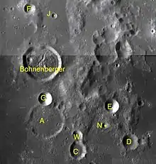 Les cratères dits satellites sont de petits cratères situés à proximité du cratère principal, ils sont nommés du même nom mais accompagné d'une lettre majuscule complémentaire (même si la formation de ces cratères est indépendante de la formation du cratère principal). Par convention ces caractéristiques sont indiquées sur les cartes lunaires en plaçant la lettre sur le point le plus proche du cratère principal. Liste des cratères satellites de Bohnenberger[8],[11] :