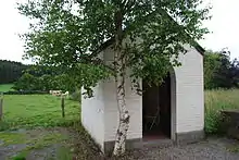 La petite chapelle blanche de Bohon se trouve au centre du hameau en bordure d'une prairie.