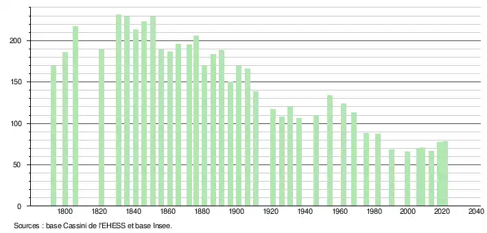 L'évolution du nombre d'habitants est connue à travers les recensements de la population effectués dans la commune depuis 1793. Pour les communes de moins de 10 000 habitants, une enquête de recensement portant sur toute la population est réalisée tous les cinq ans, les populations légales des années intermédiaires étant quant à elles estimées par interpolation ou extrapolation[15]. Pour la commune, le premier recensement exhaustif entrant dans le cadre du nouveau dispositif a été réalisé en 2008[16].